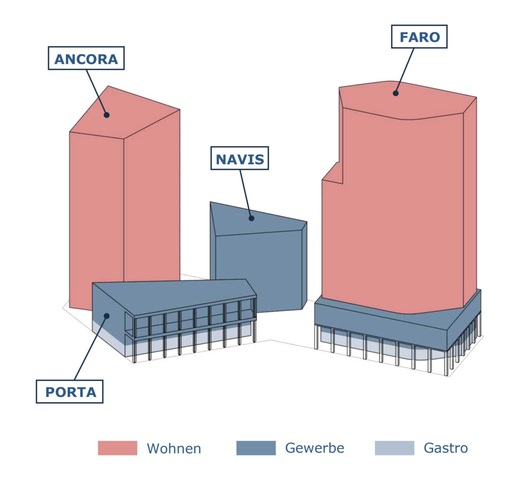 Inspiriert von der Dynamik der Seefahrt, verbinden sie maritimes Flair mit urbaner Architektur und verleihen dem Quartier einen unverwechselbaren Charakter.