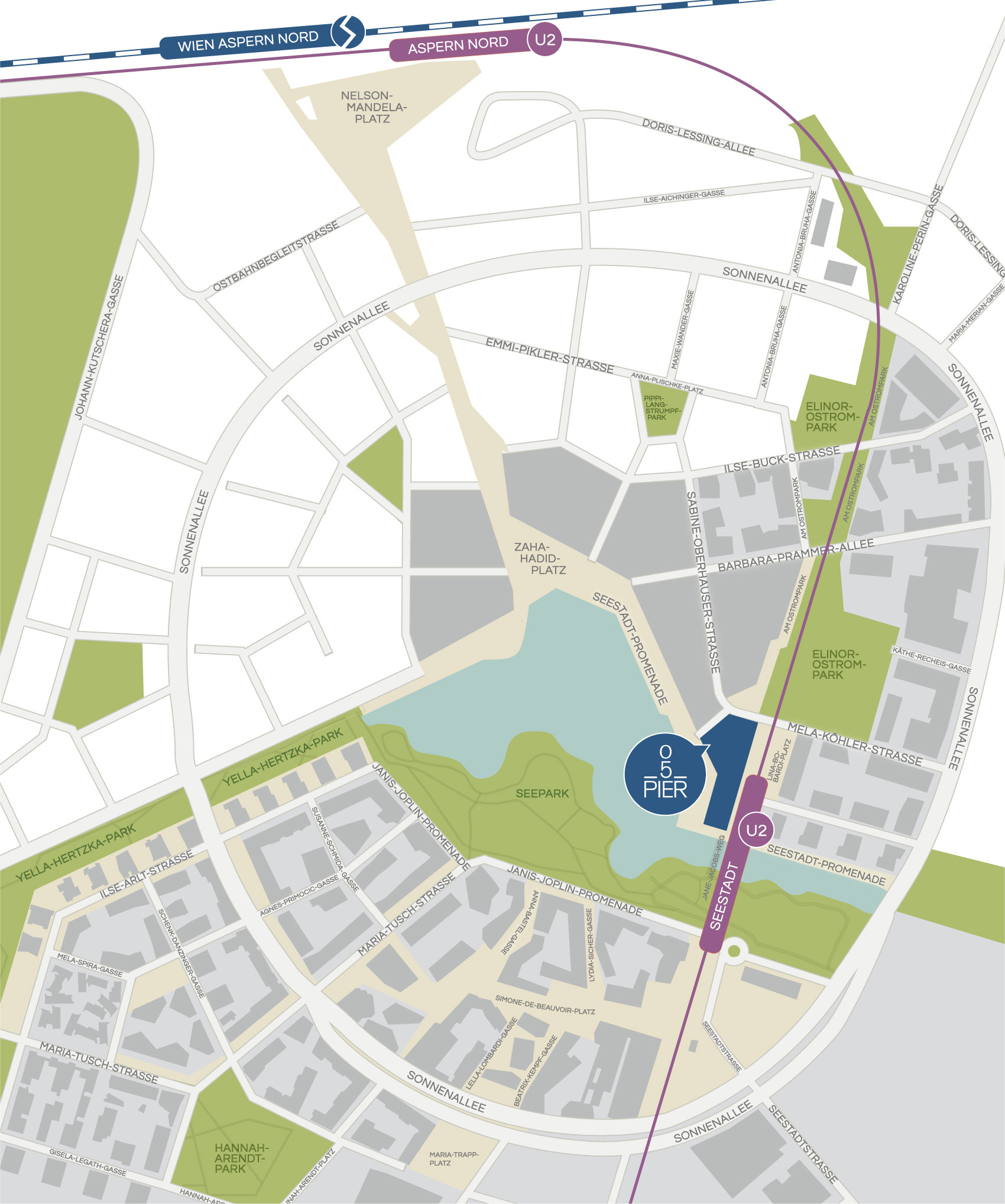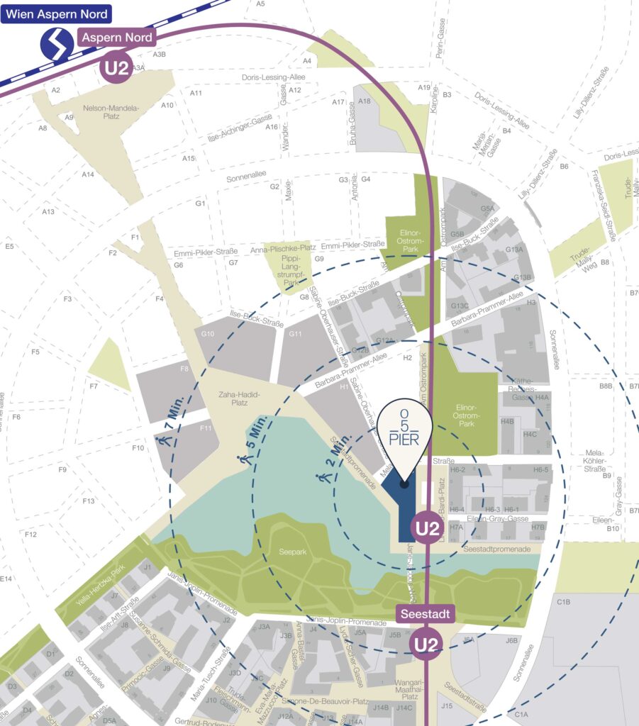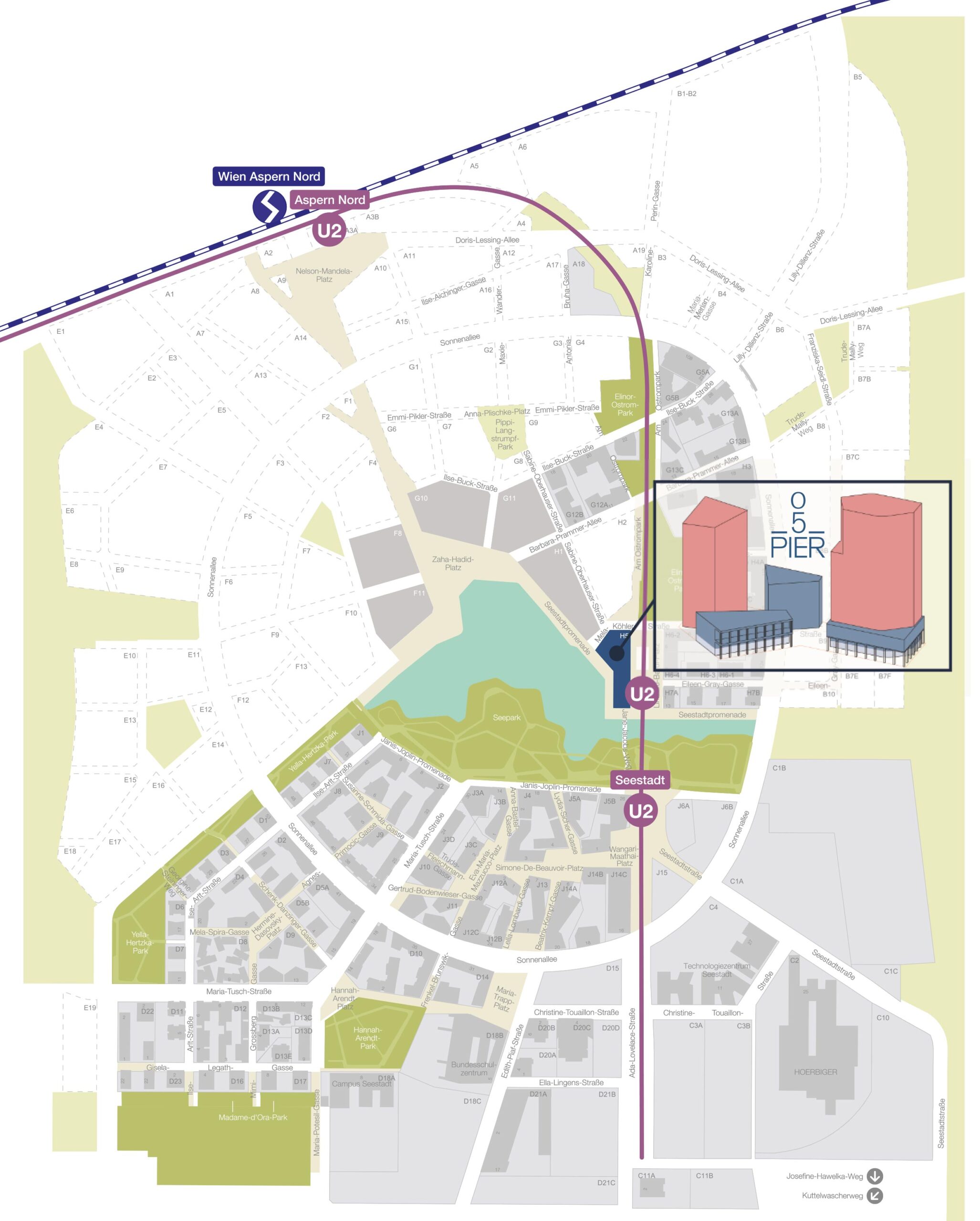 PIER05 steht für eine neue Art, sich in der Stadt zu bewegen. Direkt an der U2-Station Seestadt und mit den Buslinien 84A, 88A und 88B ist die Wiener Innenstadt in kürzester Zeit öffentlich und umweltfreundlich erreichbar – schnell, einfach und vernetzt.