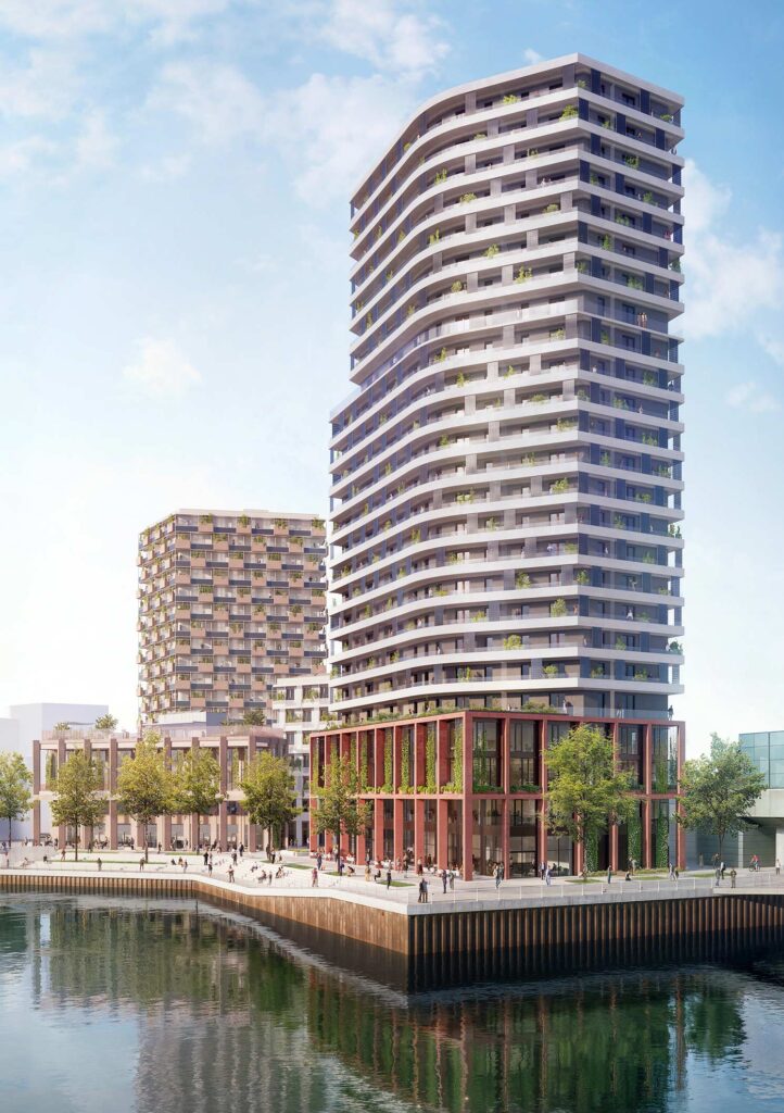 Grüne Inseln schaffen ein angenehmes Mikroklima, während Arkaden und Promenade das Quartier direkt mit dem Wasser verbinden. Unterschiedlich gestaltete Plätze und Freiflächen bieten Abwechslung – mal ruhig, mal belebt, immer inspirierend.