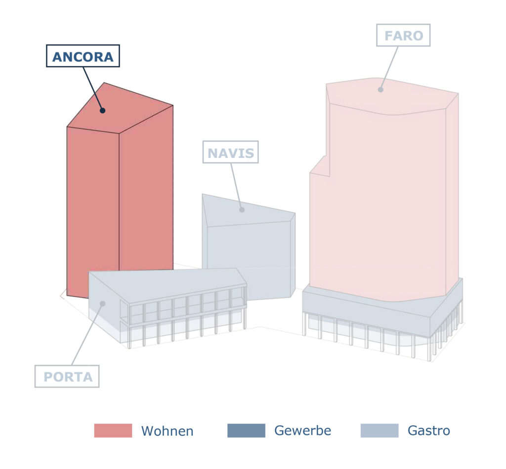ANCORA steht für modernes, urbanes Wohnen – 100 % Wohnnutzung, 100 % Lebensqualität. Das Gebäude ist ganz dem Wohnen gewidmet und setzt auf stilvolle, helle Räume mit großzügigen Freiflächen.