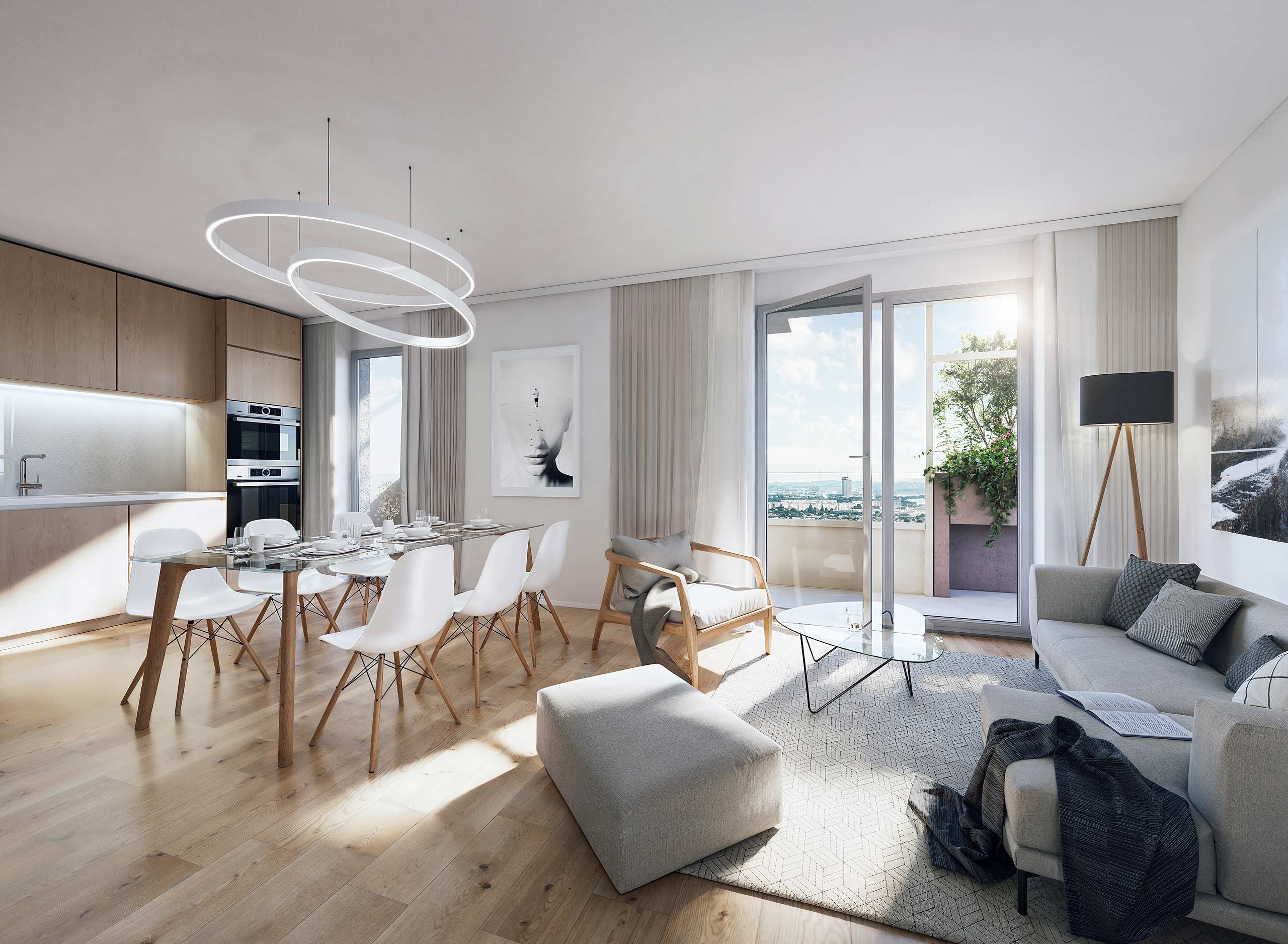 Die größeren Wohnungen orientieren sich jeweils in zwei Himmelsrichtungen und bieten so ein luftiges, lichtdurchflutetes Zuhause mit einzigartig schönem Ausblick.
