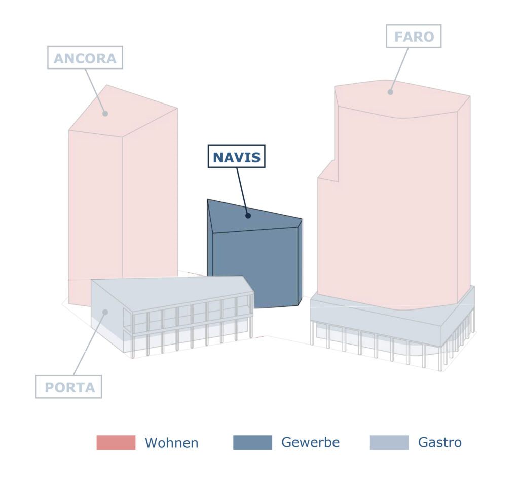 Perfekt gelegen im Zentrum des Quartiers, bestens angebunden durch U-Bahn, Bus und Fahrradinfrastruktur, bietet NAVIS Unternehmen Raum für Innovation, Wachstum und Vernetzung – Arbeiten am Wasser, urban und modern.