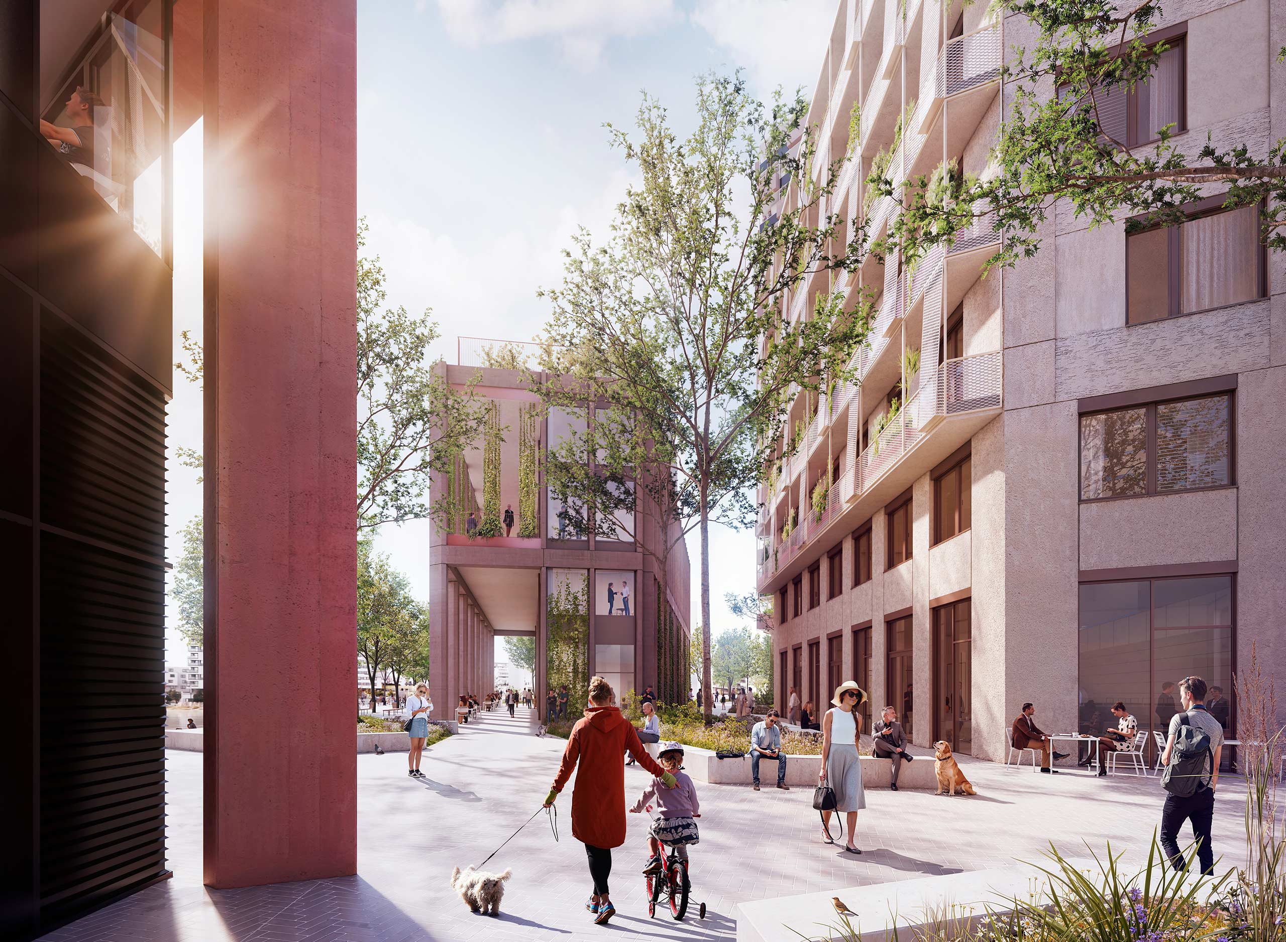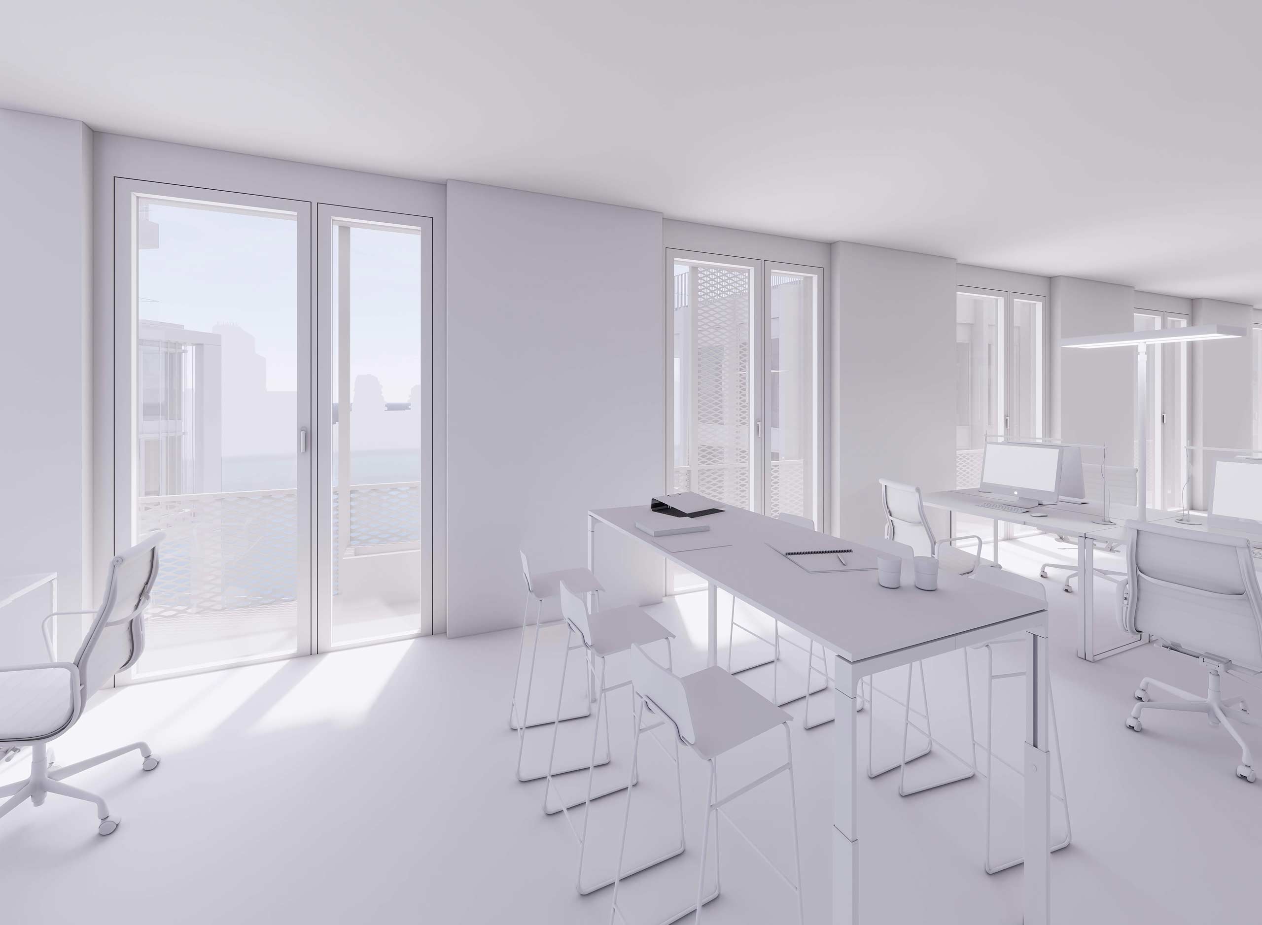 Großzügige Raumhöhen von drei Metern ermöglichen flexible Bespielung und modernes Arbeiten in einem Umfeld, das urbane Infrastruktur mit ruhigen Naherholungsbereichen und viel Grün verbindet. Öffenbare Fenster und Balkone sorgen für Licht, Luft und direkten Bezug zur inspirierenden Umgebung direkt am See.